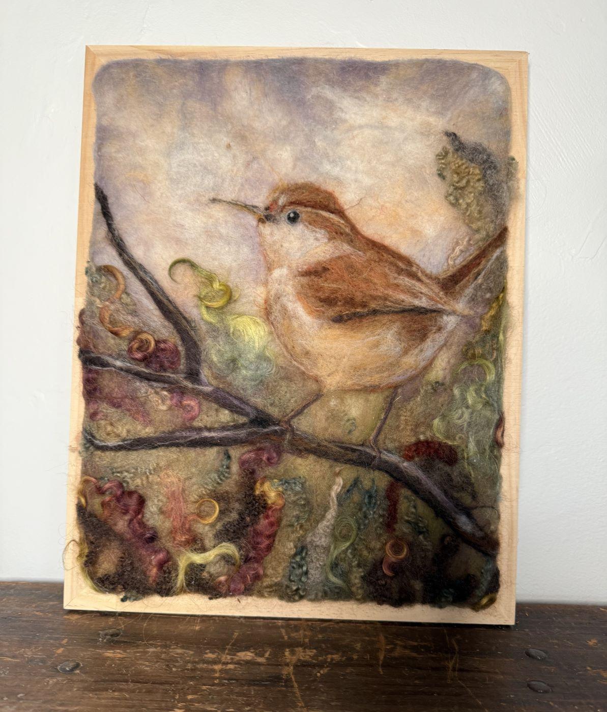 Create a charming 2D wren tapestry while exploring the art of flat-needle felting! Using wool fibers, you’ll learn to blend and layer colors on a felt “canvas,” building your composition from background landscape to the detailed wren perched on a branch.